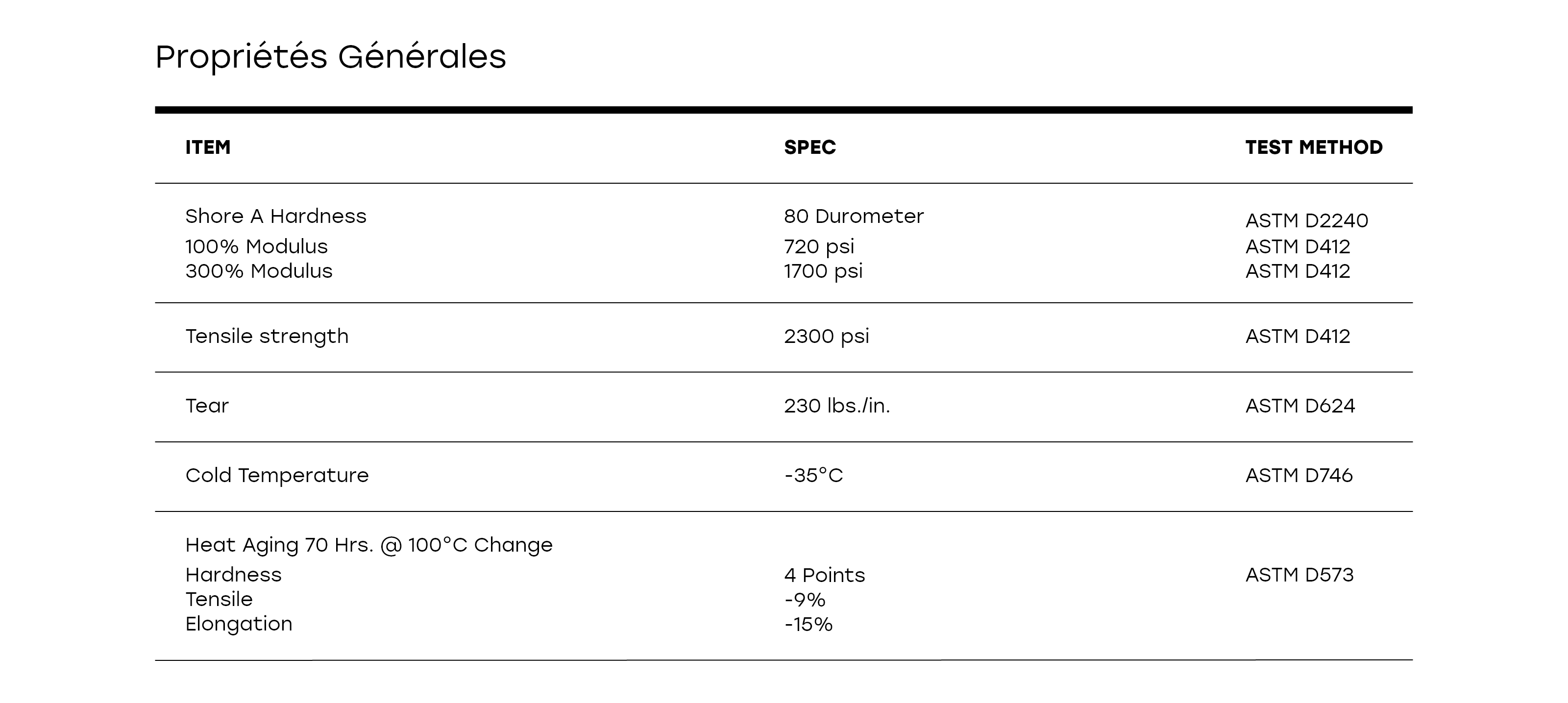 Sur l’échelle du duromètre (0 = le plus souple, 100 = le plus dur), une valeur de 80 indique un matériau dur, dense et durable. Il offre une bonne résistance à l’abrasion, ce qui le rend adapté aux applications soumises à l’usure et au frottement.