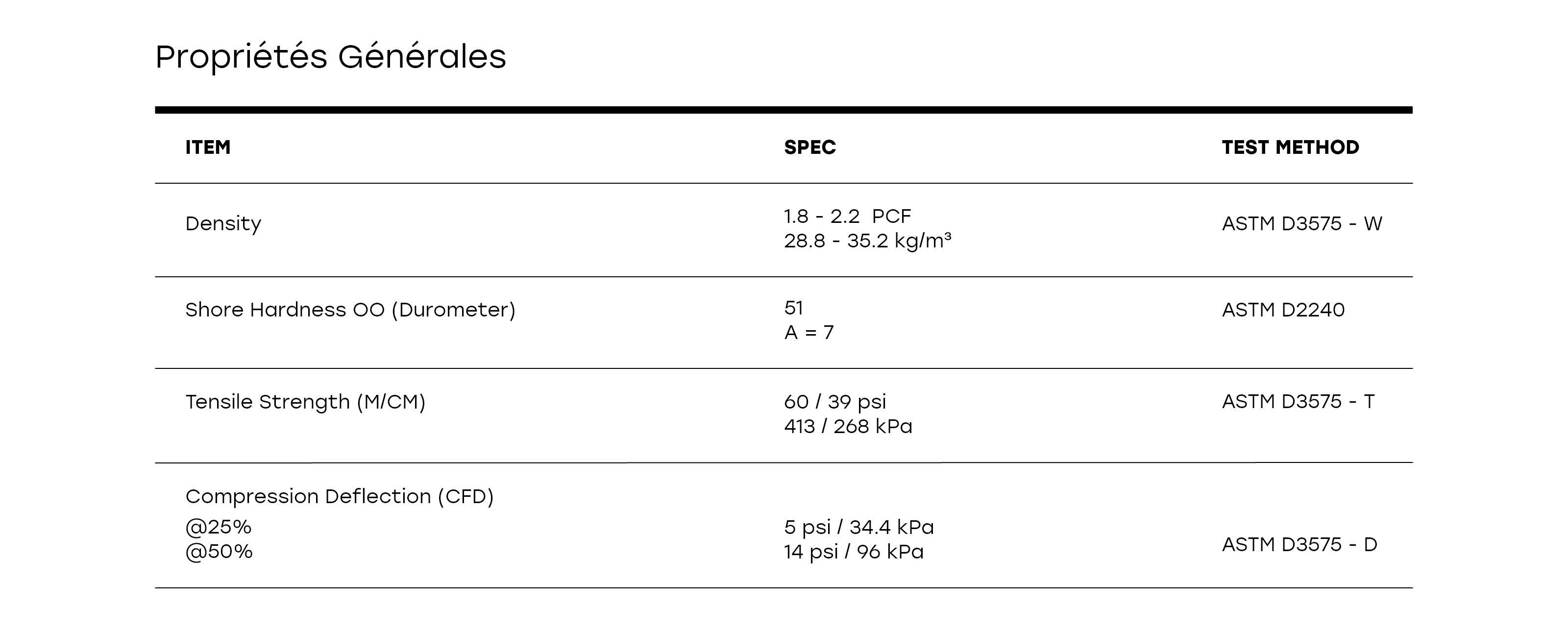 La mousse de densité 2 lb est l’option la plus souple et la plus flexible. Elle se comprime facilement et reprend bien sa forme, ce qui la rend idéale pour l’amortissement et la réduction des vibrations.