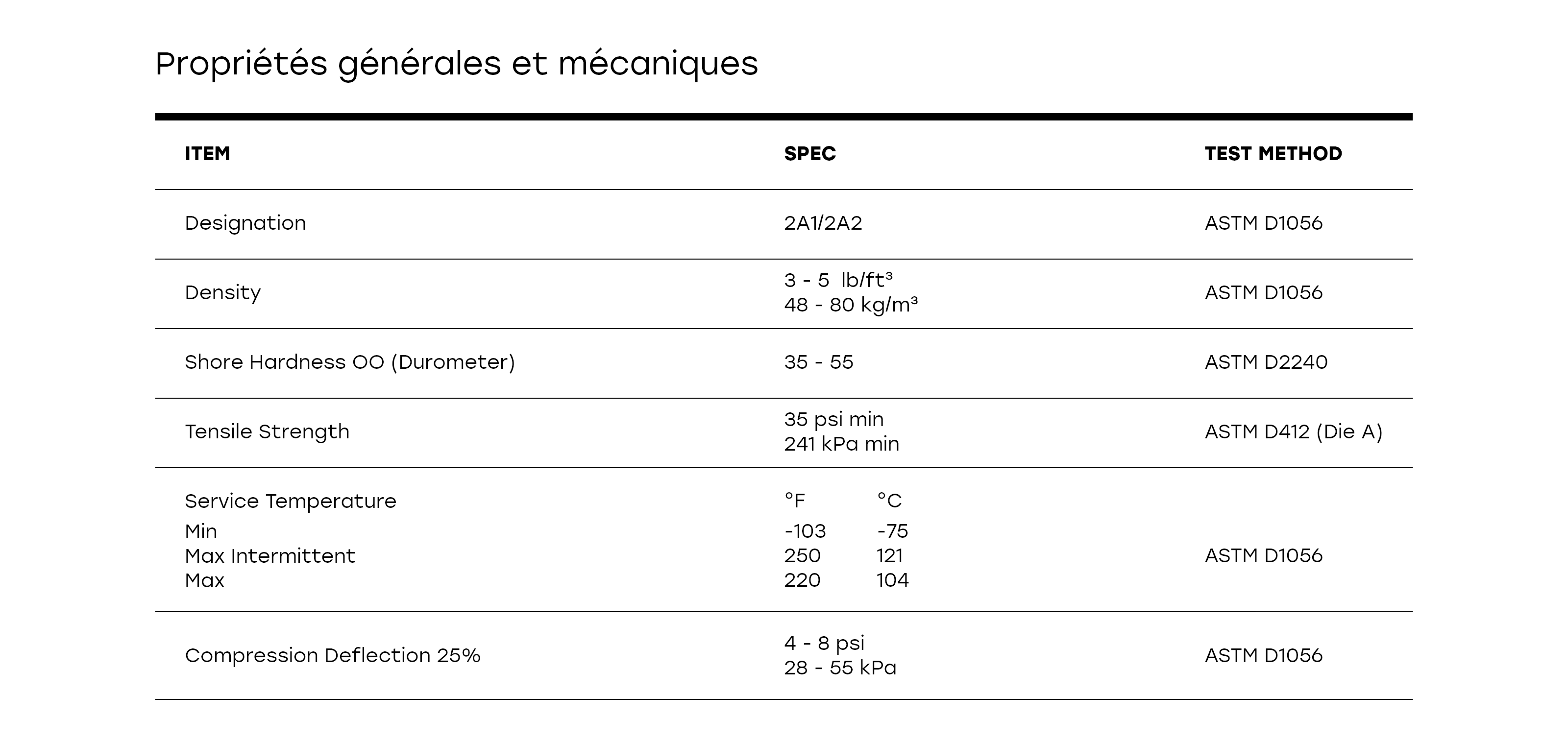 Notre EPDM Armacell présente une densité de 5 PCF (lb/pi³) et une dureté Shore de 35 à 55.