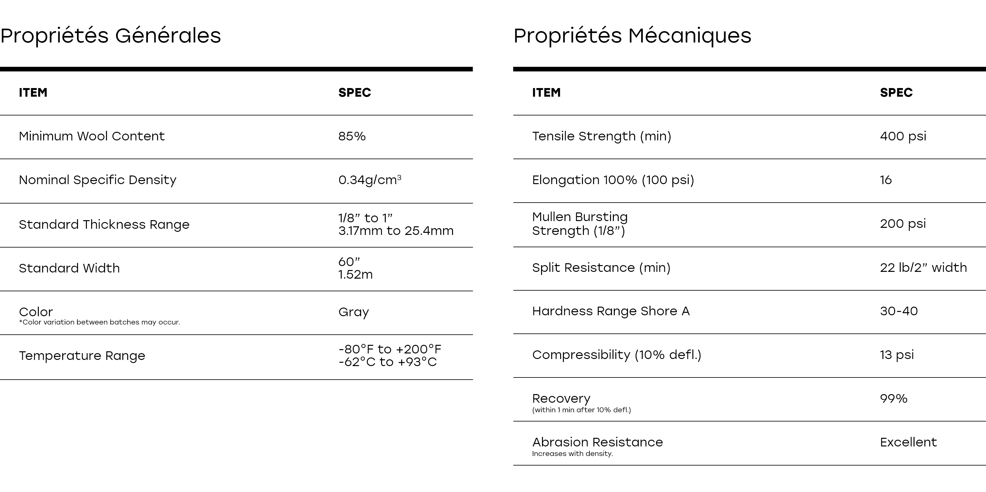 REMARQUE : Les couleurs affichées en ligne ou imprimées peuvent différer légèrement du feutre réel. Si la précision de la couleur est essentielle à votre application, nous vous recommandons de demander un échantillon physique avant de passer commande.