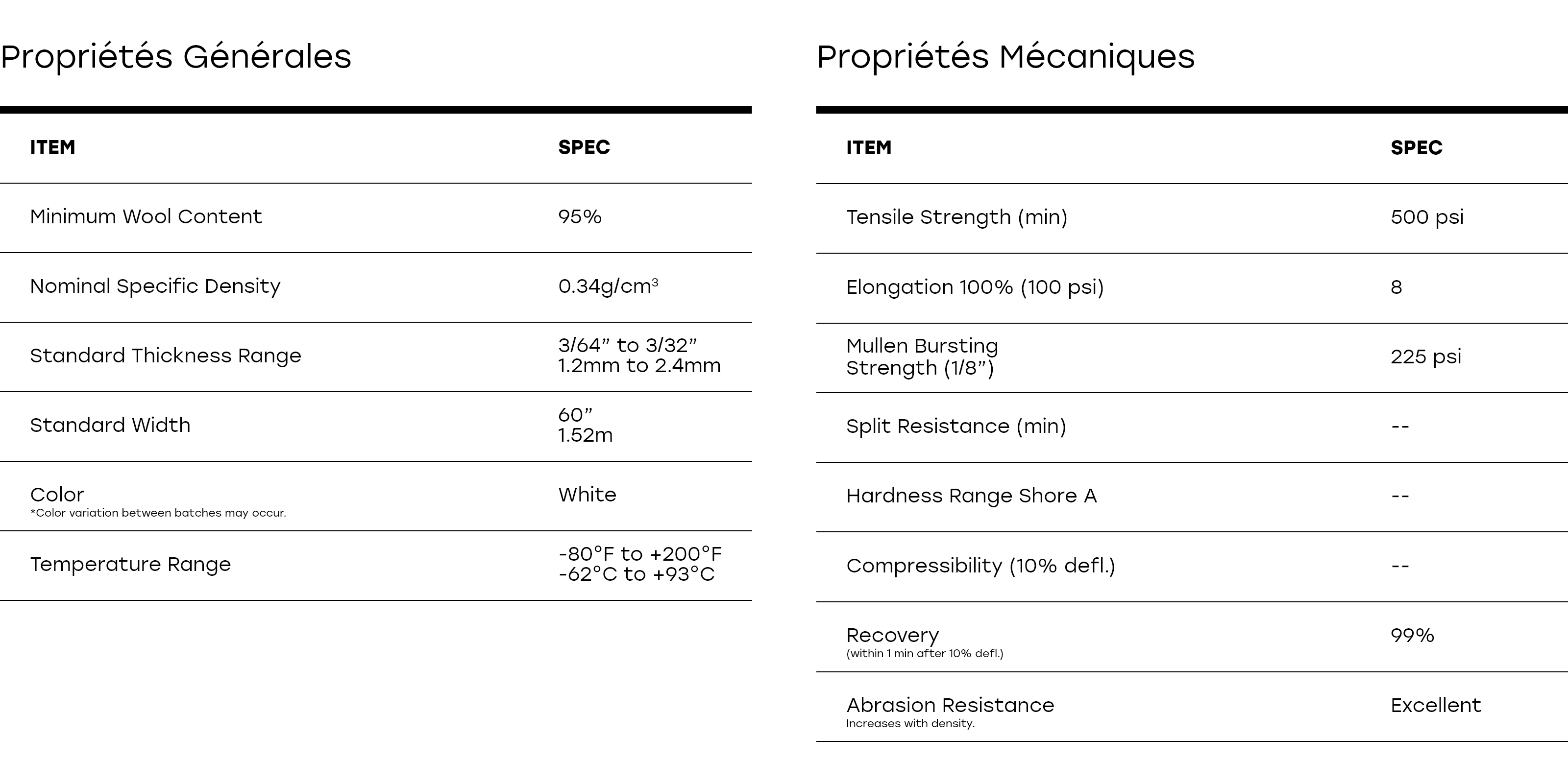 REMARQUE : Les couleurs affichées en ligne ou imprimées peuvent différer légèrement du feutre réel. Si la précision de la couleur est essentielle à votre application, nous vous recommandons de demander un échantillon physique avant de passer commande.