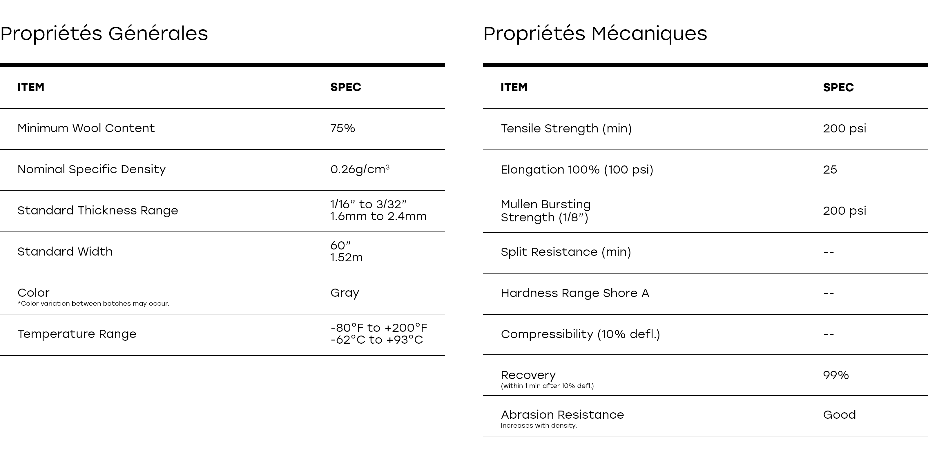 REMARQUE : Les couleurs affichées en ligne ou imprimées peuvent différer légèrement du feutre réel. Si la précision de la couleur est essentielle à votre application, nous vous recommandons de demander un échantillon physique avant de passer commande.