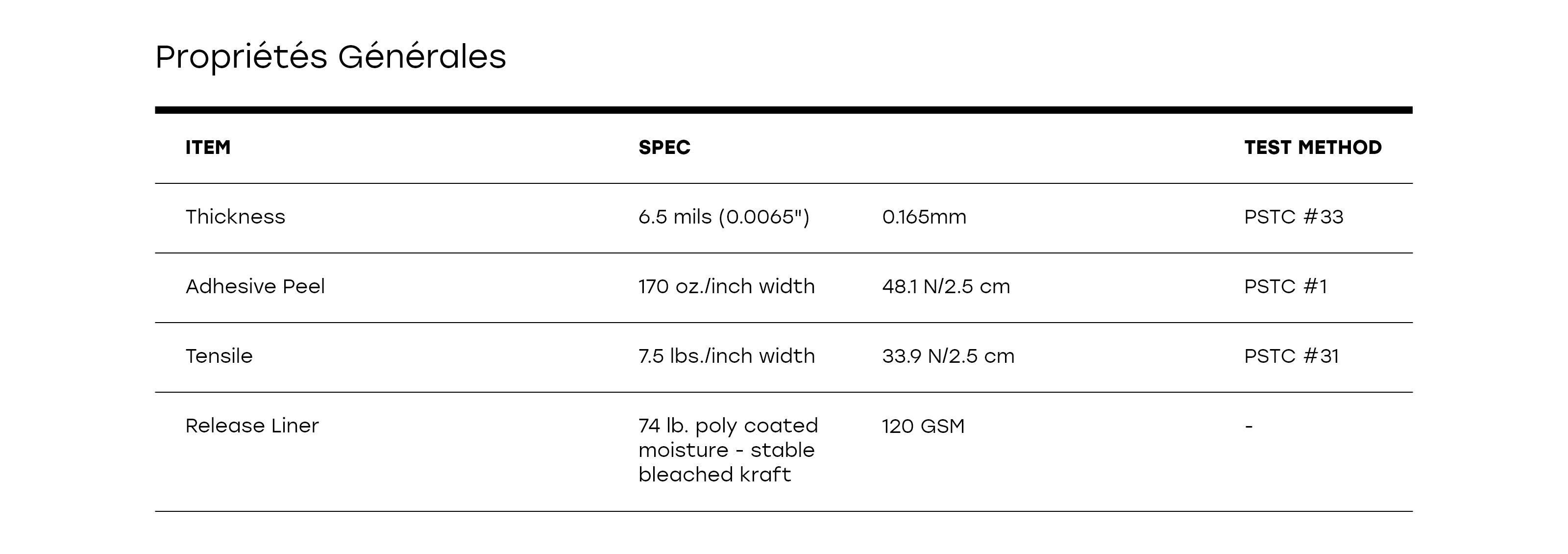 Ce ruban fonctionne sur une large plage de températures, de –30 °F à 225 °F (–34 °C à 107 °C), et présente une bonne résistance chimique. Il aide aussi à réduire les grincements et les vibrations entre les pièces en métal ou en plastique.