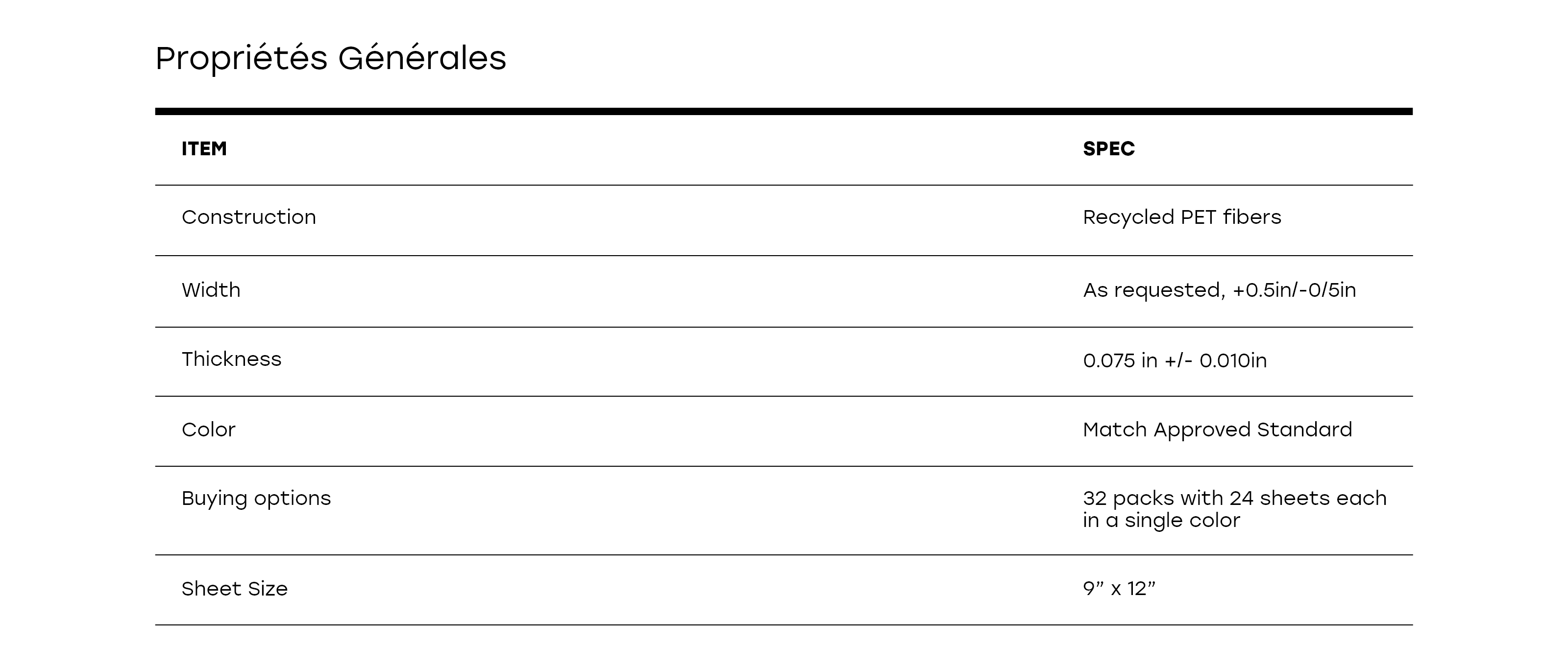 Remarque : Les couleurs affichées en ligne ou imprimées peuvent différer légèrement du feutre réel. Si la précision de la couleur est essentielle à votre application, veuillez demander un échantillon physique avant de passer commande.