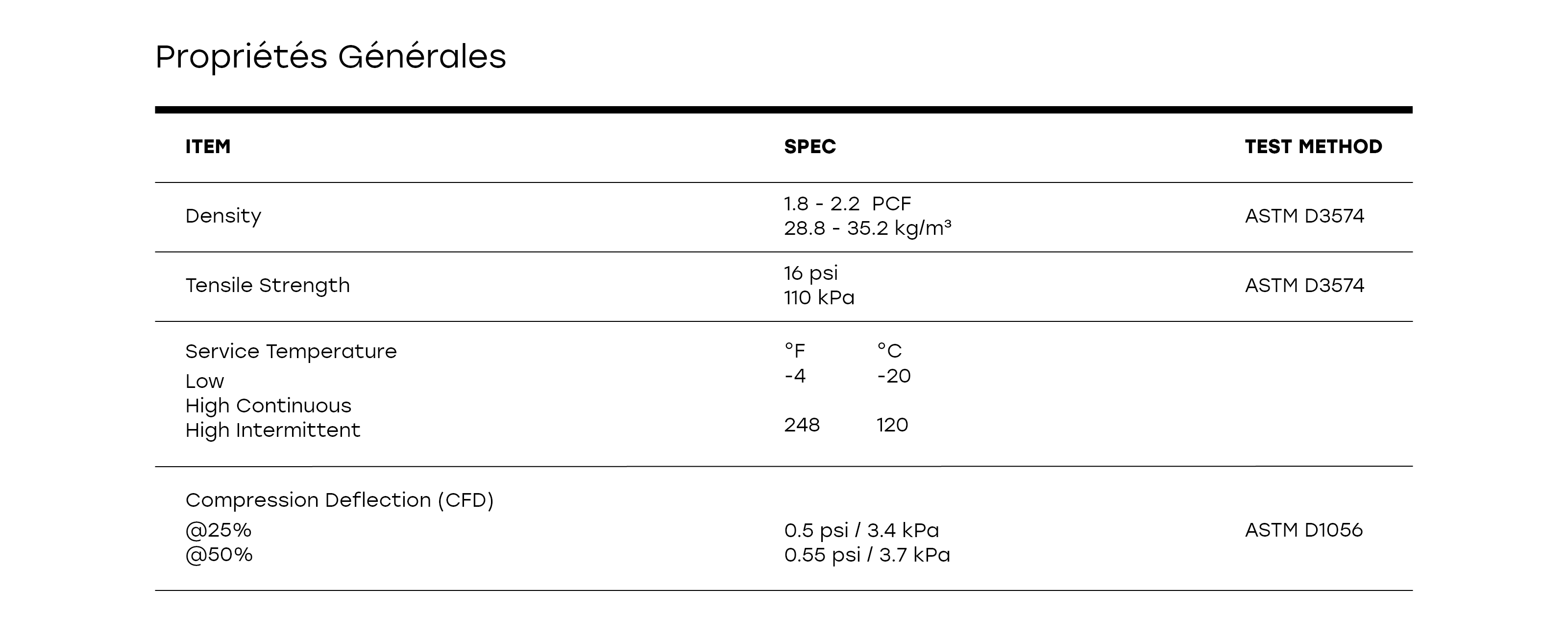 Cette mousse procure résistance, intégrité de surface et capacité de reprise après compression. Malgré sa solidité et sa durabilité, la mousse de polyuréthane conserve un faible rapport poids/volume, ce qui la rend idéale pour les applications où le poids est un facteur important.