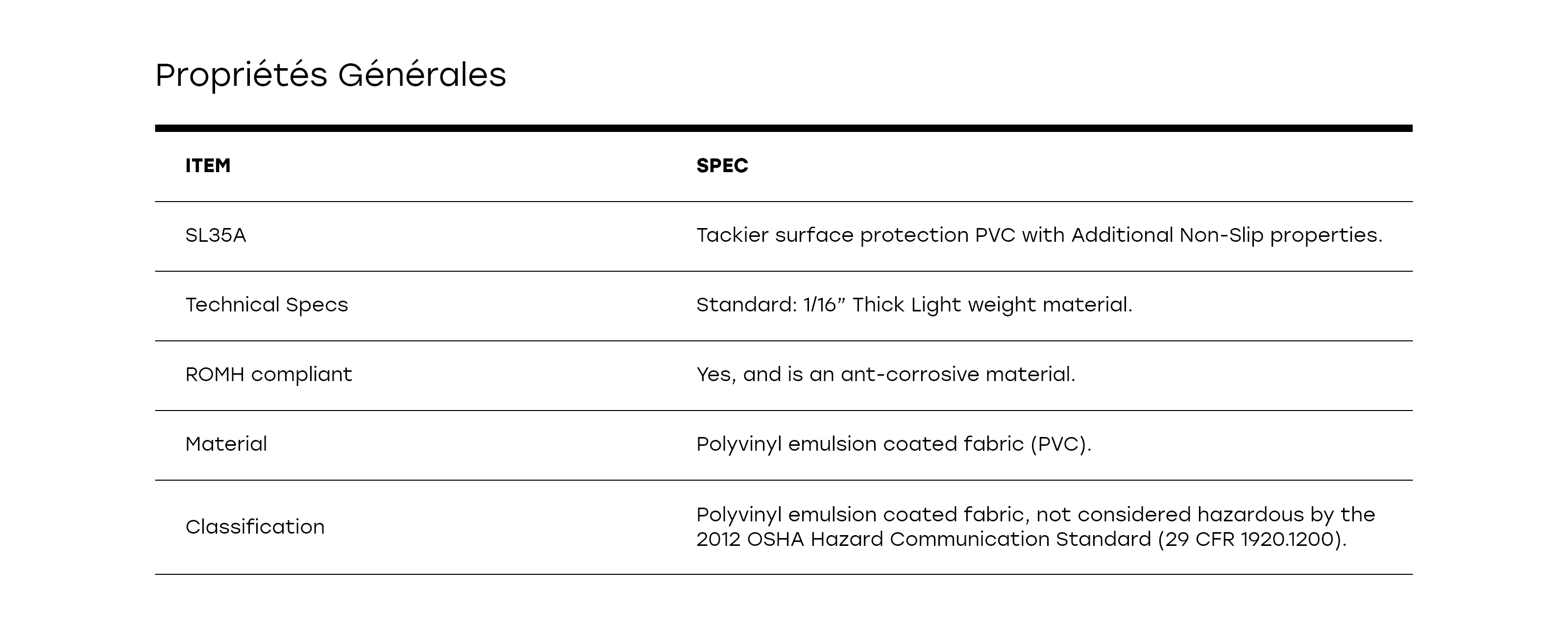 Il s’agit d’un produit léger, fabriqué à partir d’un tissu enduit d’émulsion de polyvinyle, de couleur noire. Il est hautement durable, résistant à la déchirure, antidérapant et anticorrosion. Il est conforme aux normes ROMH et California Prop 65, sans contenir de matières dangereuses.