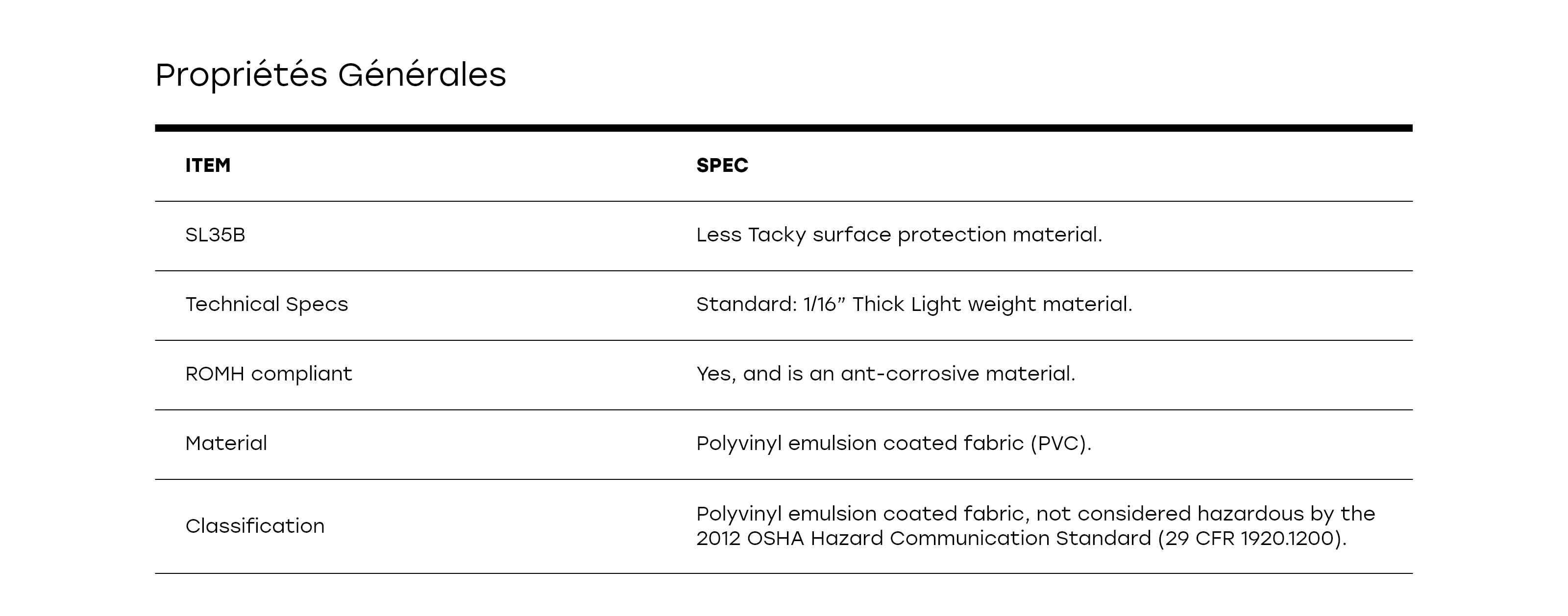 Il s’agit d’un matériau léger, fabriqué à partir d’un tissu enduit d’émulsion de polyvinyle, de couleur noire. Il est durable, résistant à la déchirure et anticorrosion. Il est conforme aux normes ROMH et California Prop 65, sans contenir de matières dangereuses.