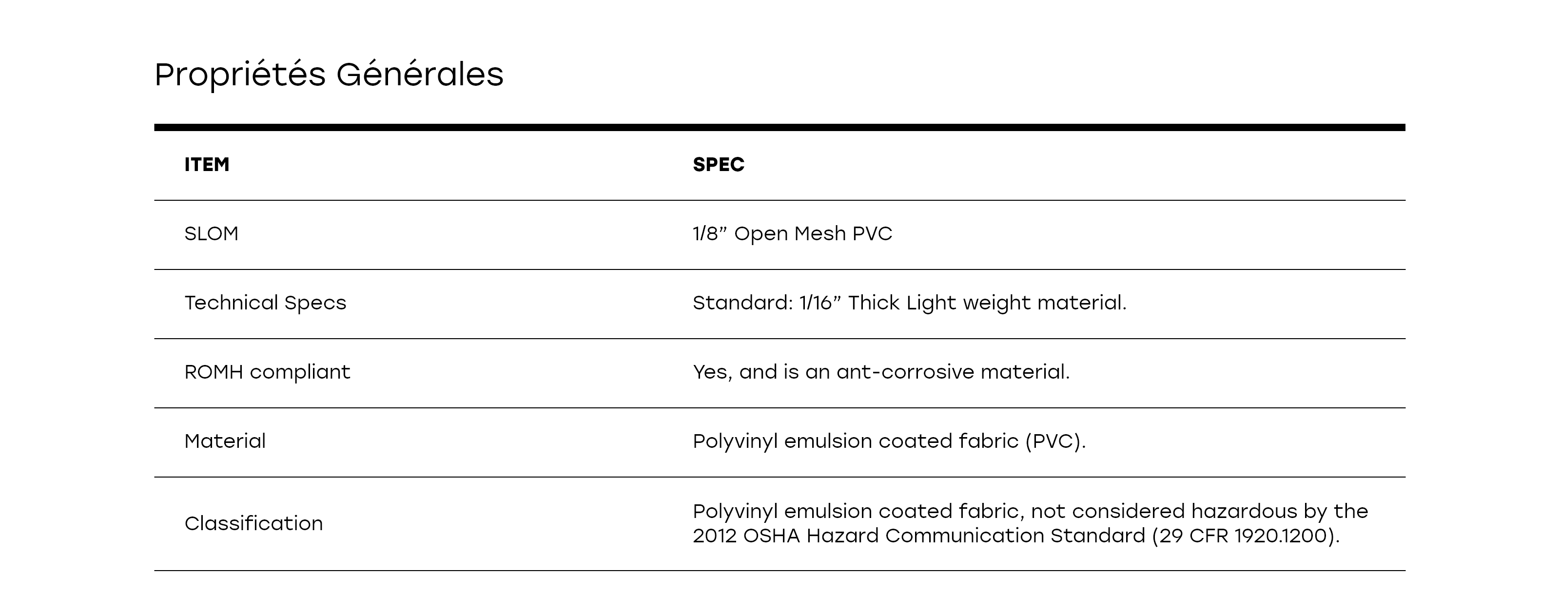 Le SLOM est un revêtement en PVC à maille ouverte innovant, fabriqué aux États-Unis. Il est conçu pour offrir une excellente adhérence tout en assurant un drainage et une ventilation supérieurs. Sa structure à maille ouverte permet la circulation de l’air et l’évacuation de l’humidité, ce qui le rend idéal pour les environnements où l’aération et le drainage sont essentiels.