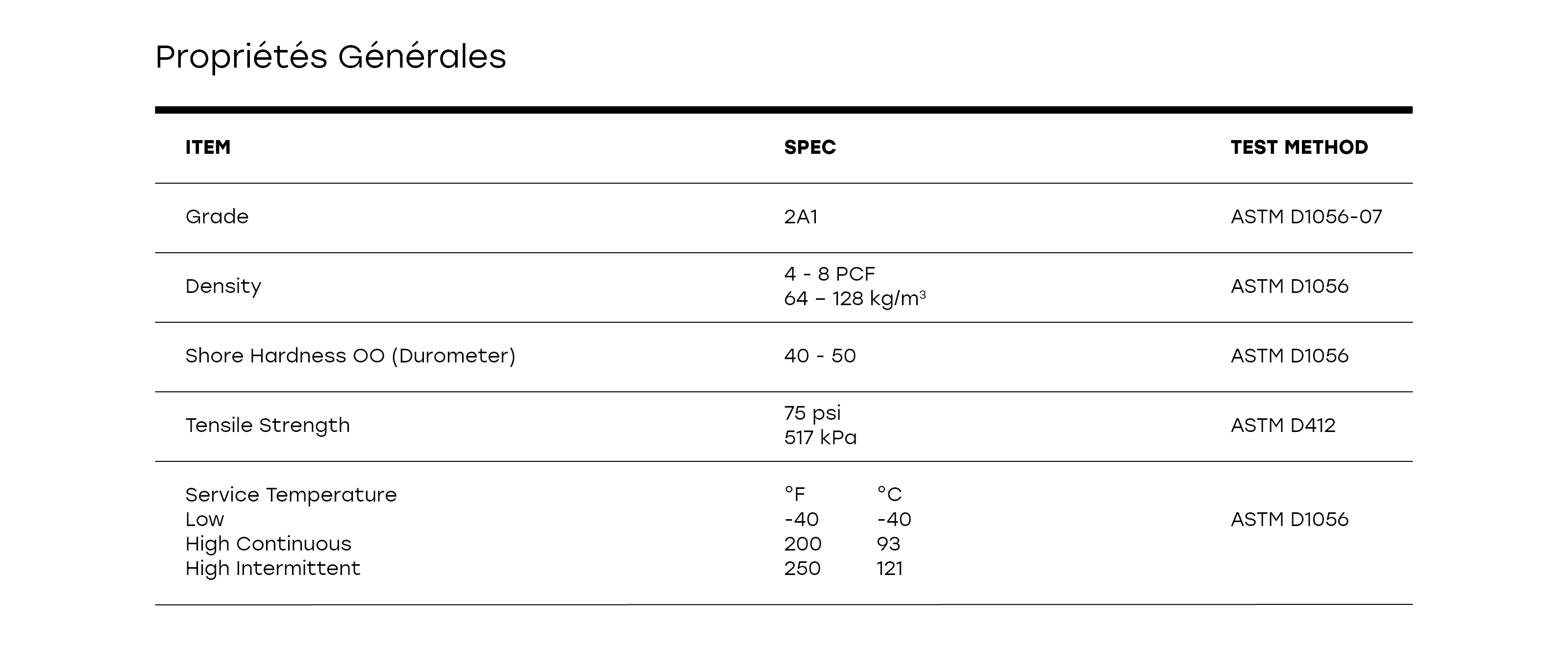Notre néoprène spongieux souple présente une densité de 4 à 8 PCF (lb/pi³) et une dureté Shore de 40 à 50.