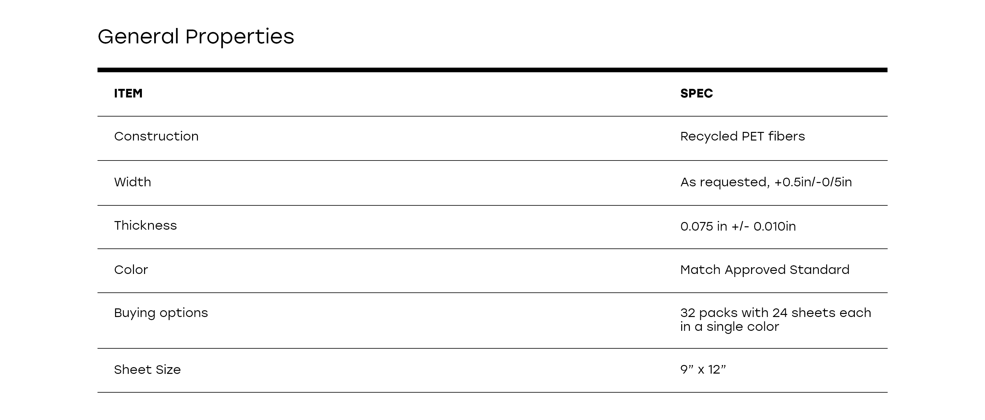 Note: Colors which appear online or in print may differ slightly from actual felt. If color accuracy is critical to your application, please request a physical sample before ordering.